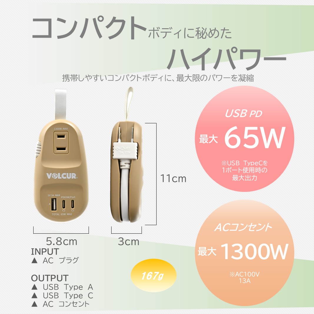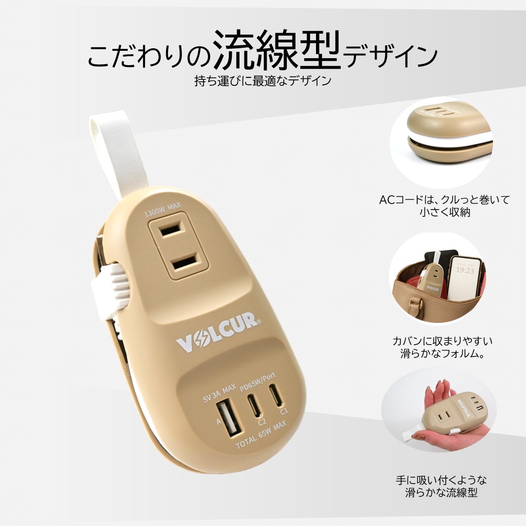流線型のエレガントなフォルムが特徴のモバイルタップ。見た目とは裏腹に、USB PD65Wの急速充電機能とACコンセントを搭載したパワフル機能を備えています。放熱性に優れ、安全にご利用いただけます。旅行や出張にも最適で、持ち運びやすさが抜群です。搭載されているACコンセントにより、充電器の増設やAC出力が必要な際にも大変便利です。