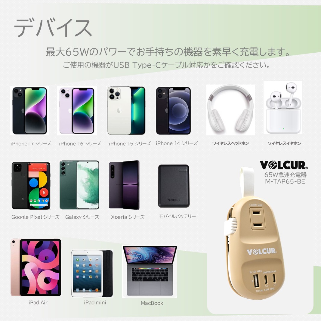急速充電規格 USB PD65W対応品でiPhone16、15、iPad、Macbook、アンドロイド、ノートPCなどの急速充電時対応しています。